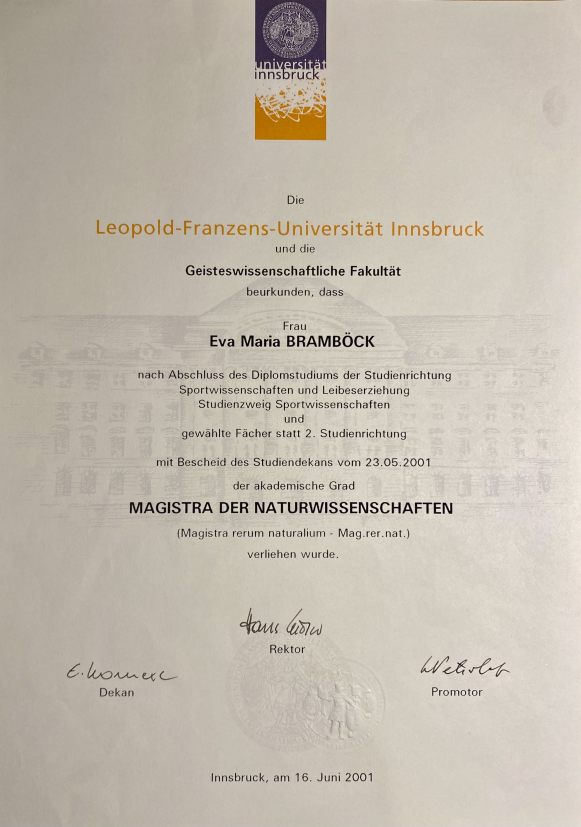 Studium Diplomstudium Sportwissenschaften mit Schwerpunkt Prävention - 1996-2002: